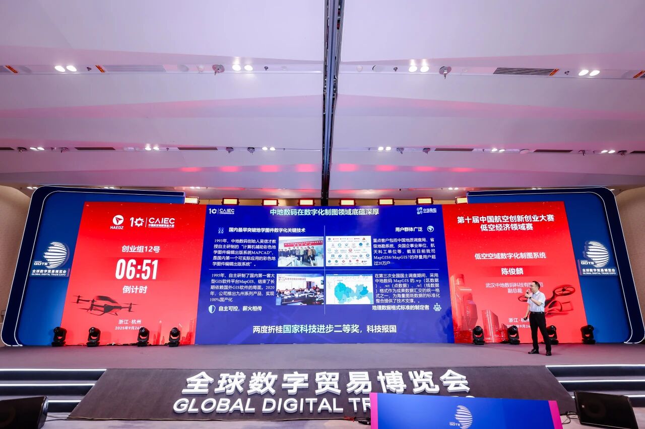 2025年9月26日至27日,作为第四届全球数字贸易博览会重要活动之一,第十届中国航空创新创业大赛 “低空经济+未来空间”领域赛,在杭州大会展中心隆重举行。本次大赛由中国航空学会、中国航空工业集团有限公司、中国航空发动机集团有限公司等联合主办。活动汇聚了全国航空航天领域的顶尖专家、投资机构及创新团队,共同聚焦低空经济与未来空间两大前沿领域,为推动空天产业创新发展注入新动能。中地数码《低空空域数字化制图系统》...