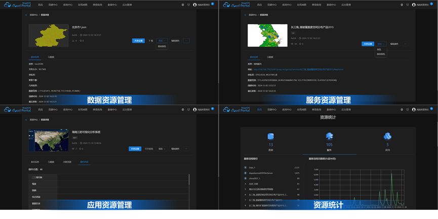 ●整合数据、服务、应用、地图、大屏、典型应用等资源,实现多种资源的统一管理
