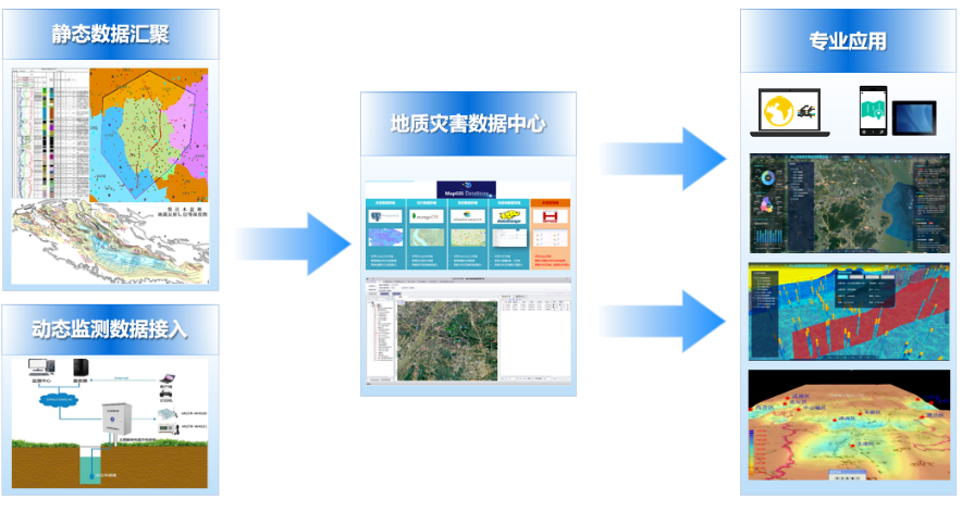 MapGIS地质灾害信息化解决方案以地质灾害监测防治需求为动力,汇聚整合地质灾害历史调查数据、成果数据、动态监测数据,以高效的数据管理方式统一管理多维地质灾害相关数据,建立地质灾害数据中心,以安全自主可控的MapGIS平台为基础,搭建地质灾害信息化应用平台,形成数据与业务深度融合的分析评价、监测预警、应急处置等多种专业应用,为各级政府有效开展地质灾害防治、保障经济社会发展提供地质灾害信息和科学决策依据。